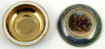 Československo, Aich, Doubí u Karlových Varů 1908 -1922. Bílý, barevný a ručně zlacený porcelán s potiskem. Porcelánka Aich (Doubí) v Doubí u Karlových Varů založená roku 1849 Janem Möhlingem. Po první světové válce v roce 1922 byla začleněna do koncernu EPIAG. Průměr 8 cm, výška s víkem 4 cm. Malá porcelánová dózička kulatého tvaru dekorovaná zlaceným florálním motivem a linkami. Ústředním motivem na víku je potisk v podobě vyobrazení dvou sedících chlapců a jednoho psa v koutě zahrady orámovaný zlatými linkami a řetízkem. Na rubové straně víka zlatý nápis Karlovy Vary, vnitřek dózy celozlacený. Značeno zespodu: Aich, CZECHOSLOVAKIA.
