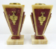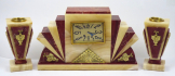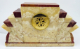 Francie, Paříž, 30. léta minulého století. Zlatý a červený onyx (aragonit), mosaz. Půlové bití na zvonek, kotvový krok. Hodiny: výška 28,5 cm, šířka 48 cm. Výška dekorativních svícnů 24 cm. Art deco stylové krbové hodiny ze zlatého a červeného onyxu s mosaznými zdobnými aplikacemi. Zlatavý ciferník s černými číslicemi. Hodinový stroj značený EXACTA. Výrobce: LEBREJALE, PARIS. Vzhledem ke stáří hodin bez záruky přesnosti chodu a dlouhodobé funkčnosti. K hodinám patří i dva dekorativní svícny s vyjímatelnými kalíšky.