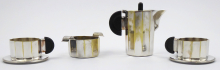 Postříbřená mosaz. Období a styl: art deco. Celková hmotnost 434 g. Postříbřený set pro dvě osoby sestávající se ze dvou šálků s podšálky, cukřenky a konvičky. Zdobená ve stylu art deco svislými kanelurami, půlkulatými bočními úchyty z černě mořeného dřeva. Střední Evropa 1925 - 1935. Výška konvičky 10 cm, průměr cukřenky 6 cm, výška šálků 3,5 cm, průměr podšálků 8 cm.