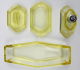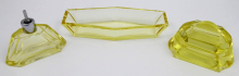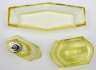 Československo 1920 - 1940. Žluté citrínové sklo, ručně broušené. Období a styl art deco. Toaletní souprava složená z flakonu, dózy a misky. Rozměr obdélné misky 21 cm x 8,5 cm x 3,5 cm. Rozměr dózy s víkem 12 cm x 7 cm x 8 cm. Rozměr flakonu 11 cm x 9,5 cm x 5 cm. Toaletní art deco set zdobený fazetami a zabrušovanými okraji.