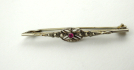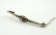 Bílý kov, kámen, sklo. Ve stylu a tvaru diamantových broží začátku minulého století. Celková hmotnost 1,95 g. Jemná brož napodobující diamantové brože zdobená jemným prořezávaným ornamentem uprostřed v korunce vsazená růžová dubleta. Na čelní straně ornament granulace a reliéfu připomínající markazity. Gravírovaný ornament. Střední Evropa 1900 - 1920. Délka 48 mm.