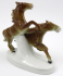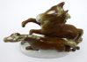 Bílý a barevně ručně malovaný porcelán. Porcelánová soška dvou cválajících hnědých koní na bílém stylizovaném podstavci. Značeno zespodu: porcelánka Carl Scheidig, Gräfenthal. Německo, Gräfenthal 1935 - 1972. Výška 14,5 cm.