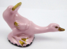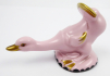 Československo, Trnovany u Teplic 1924 - 1925. Růžová keramika, ručně barevně malovaná a zlacená. Období a styl: art deco. Firma Ditmar & Urbach vznikla v Trnovanech spojením znojemské továrny Dr. Rudolfa Ditmara a teplické společnosti bratří Urbachů v roce 1920. Výška 6 cm, šířka 10 cm a hloubka 5 cm. Ručně barevně malovaná a zlacená art deco figura kachničky z růžové keramiky. Kachna natahující krk je umístěna na nepravidelném nízkém podstavci ve spodní části zdobeném černým stylizovaným krajkovím. Ručně zlacený zobák, letky i ocas a blány na nohách. Na zadní části ocasního peří stékaná glazura. Značeno zespodu: firemní značka, v tomto případě figura jelena s nápisem DUCA, která se vyskytuje pouze ojediněle na výrobcích Ditmar & Urbach a vtlačená čísla.