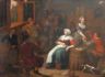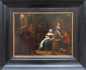 Německy mluvící region, 18. století. Olej na dřevěné desce 32 cm x 41,5 cm. Podle předloh slavného holandského haarlemského malíře 17. století: Jan Miense Molenaer (1610-1668) namaloval německy mluvící malíř. Celkový rozměr s rámem 48 cm x 59 cm. Výjev z přeplněné krčmy s šenkýřkou v popředí. Na zadní straně štítek se jménem neméně významného dalšího holandského malíře 17. století Adriaena Brouwera (1605-1638). V černě mořeném profilovaném rámu ze zlacenou vnitřní lištou.