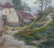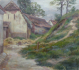 Čechy 1900 - 1920. Olej na papíru 33 cm x 38 cm. Nesignováno. Období a styl české krajinomalby ovlivněné tvorbou vynikajícího českého malíře Antonína Slavíčka. Pohled na zákoutí u starých domů s pěšinou vedoucí do travnatého svahu. Novodobější rám s novou paspartou a sklem 50,5 cm x 53,5 cm.