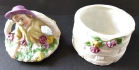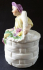 Ručně malovaný biskvit. Ve tvaru proutěného košíku. Horní část, víčko, odnímatelné. Zdobené polopostavou zahradníčka s reliéfními květy a lístky. Umístěného pod úchytem košíku. Spodní část, dóza, válcovitého tvaru, s reliéfním ornamentem proutí a růží. Neznačeno. Střední Evropa 1900 - 1920. Výška 11 cm, šířka 7 cm.