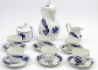 Československo, Dubí, druhá polovina minulého století. Bílý, ručně kobaltově malovaný a zlacený porcelán. Ve stylu porcelánky Míšeň. Karlovarský porcelán, závod Dubí. Výška konvice 20 cm, výška konvičky na mléko 9 cm, výška cukřenky 9 cm, výška šálků 4 cm, průměr podšálků 10,8 cm. Moka servis složený z kávové konvice, konvičky na mléko, cukřenky a 6 šálků s podšálky. Bílý porcelánový servis s ručně kobaltovou modří malovanými čínskými draky doplněný o zlacené a červené ornamenty. Horní úchyty zdobené reliéfními květy. Značeno zespodu: značka výrobce, CZECHOSLOVAKIA, HAND PAINTED.