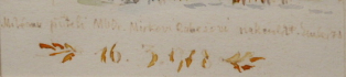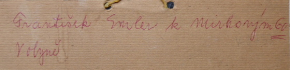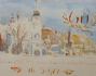 Československo, Volyně, rok 1978. Akvarel na papíru 9,5 cm x 12 cm. Signováno s věnováním v dolní části: Milému příteli MUDr. Mirkovi nakreslil F. Emler 78. Dole uprostřed datum 16.3.1978. Vzadu rukou malíře: "František Emler k Mirkovým 60 Volyně". Autor: František Emler (1912-1992). Volyně s domy a kostelní věží v popředí. Vlevo nahoře číslo 60 zdobené vavřínovým věncem. S paspartou a sklem.