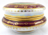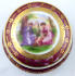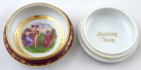 Bílý, barevný a zlacený porcelán. V romantickém stylu, předloha Angelica Kauffman (1741-1807). Porcelánka Epiag: Erste böhmische Porzellan-Industrie A. G. (První akciová společnost pro průmysl porcelánový v Čechách), závod Stará Role. Kulatá dóza s ústředními barevnými tištěnými motivy podle obrazů A. Kauffman. Zespodu víčka zlatý nápis: Karlovy Vary. Značeno zespodu: zeleně Epiag, Royal, Čecho - Slov. Československo, Stará Role 1921 - 1935. Výška 5 cm, průměr 8,5 cm.