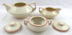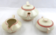 Krémově bílý a červený porcelán. V kubistickém stylu. Název modelu: Annabella. Větší konvička s víčkem, cukřenka s víčkem, konvička na mléko s nálevkou. V kubistickém tvaru zdobené červenými linkami. Porcelánka Stará Role, Epiag. Československo, Stará Role 1918 - 1950. Značeno zespodu: zeleně Epiag Czechoslovakia Annabella Modele Depose. Výška konviček 13 cm a 8 cm. Výška cukřenky 8 cm.