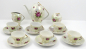 Německo, Thüringen, Reichenbach, 50. až 60. léta minulého století. Bílý, ručně zlacený a barevný porcelán, perleť. Výrobce: Porzellanmanufaktur Erwin Jähnert, Reichenbach. Výška konvice 16 cm, výška konvičky na mléko 9,5 cm, výška cukřenky 8,5 cm, výška šálku 5 cm a průměr podšálku 11,5 cm. Kávový porcelánový servis složený z konvice, konvičky na mléko, cukřenky a šesti šálků s podšálky. Servis je dekorovaný perleťovou glazurou vytvářející efekt duhové barevnosti, s ručně zlacenými úchyty a tištěnými barevnými květy růží s úponky a listy. Značeno zespodu: modrá značka s písmeny EJR.