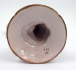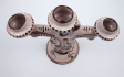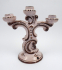 Západní Slovensko, Stupava 1900 - 1930. Ručně malovaná fajáns. Výška 26 cm, šířka 26 cm a průměr podstavce 13,5 cm. Trojramenný fajánsový svícen na nožce spočívající na kruhové základně. Tělo je reliéfně rokajově modelováno do formy. Tělo i tři kalíšky na svíčky ručně malované kobaltem s ornamenty představující linky a punktování. Na dně připevněn otvor. Značeno zespodu: číslo formy 552 psané burelem a prolnutá značka ST.
