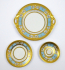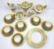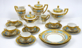 Československo, Slavkov a Karlovy Vary, 30. až 40. léta minulého století. Bílý, barevně ručně malovaný a zlacený porcelán. V neoklasicistním stylu. Bílý porcelán s modrým pásem od porcelánky Slavkov (Schlagenwald). Barevně ručně malovaný květinový dekor a zlacení od firmy Fritz Treuer, Haus-Astoria, Karlovy Vary. Kompletní servis na kávu a čaj čítající 19 ks: šest šálků s podšálky, kávovou konvici, čajovou konvici, konvici na mléko, konvičku na smetanu , cukřenku, šest dezertních talířků a dva podnosy. Výška šálků 6 cm, průměr podšálků 15 cm, výška kávové konvice 24 cm, výška čajové konvice 20 cm, výška konvice na mléko 19 cm, výška konvičky na smetanu 12 cm, průměr dezertních talířků 18,5 cm, průměr obou podnosů 30 cm. Porcelánový servis v neoklasicitním stylu s jemným květinovým dekorem a silným zlacením. Kávové a čajové konvice, konvice na mléko a konvička na smetanu dekorované na bleděmodrých polích zlatými kartušemi s malými stylizovanými růžičkami s úponky a lístečky a vertikálními i horizontálními úzkými linkami a punktováním. Víka zakončená zlatými piniovými šiškami. Hrdla (hubičky) konvic zdobí reliéfní stylizovaní ptáčci. Oba podnosy s obloukovitě reliéfně tvarovanými úchyty. Značeno zespodu: FRITZ TREUER, KARLSBAD, HAUS-ASTORIA, tištěnou značkou Schlagenwald a ručně psaným nápisem Handgemalt, echt Gold (ručně malováno, pravé zlato).