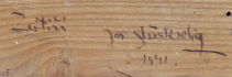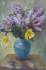 Čechy, rok 1941. Olej na plátně 91 cm x 61 cm. Signováno vpravo dole s datací 1941. Autor: Josef Glückselig (1908-1986). Velké zátiší s fialkovými šeříky v modré váze doplněnými o dva jasně žluté květy se střapatými okvětními lístky, jež malbu prozáří. Celkový rozměr s rámem 110 cm x 80 cm. V rámu s lehce zlatavou patinou dekorovaném ručně řezanými florálními motivy a stylizovanou volutou.