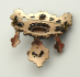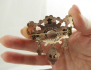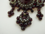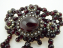 Čechy 1840 - 1870. Tombak, přírodní ručně broušené české granáty, leštěný přírodní almandin a říční perličky. Období a styl: biedermeier. Celková hmotnost 22,70 g. Rozměr brože: 55 mm x 60 mm. Větší biedermeierová brož z tombaku s centrální muglí leštěného přírodního almandinu obklopeného říčními perličkami. Tělo brože se třemi ověsky tvořené pravými českými ručně broušenými granáty a říčními perličkami stylizovanými do podoby okvětních lístků.