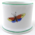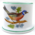 Bílý a barevně ručně malovaný porcelán. Porcelánka Herend. Stojánek na párátka válcovitého tvaru se zelenými linkami. Na čelní straně ručně malovaný motiv ptáčka sedícího na větvi. Na druhé straně motiv barevného motýla. Značeno zespodu: modře Herend, Hungaria, erb, 1943. Maďarsko, rok 1943. Výška 3,5 cm, šířka 4,5 cm.