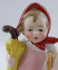Bílý a ručně barevně malovaný porcelán. Soška stojící holčičky s červeným šátkem, krátkými zelenými šaty a botami. V jedné ruce holčička drží žlutý deštník. Neznačeno. Vzadu vtlačené číslo 17022. Evropa, minulé století. Výška 9,5 cm.