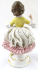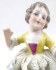 Bílý, barevný, ručně malovaný a zlacený porcelán. V tradičním stylu německých porcelánek Volkstedt Rudolstadt. Sukénka místy poškozená. Stojící dívenka v bílé krajkové sukni s dolním růžovým krajkovým lemováním. Rokokově tvarovaný mírně klenutý podstavec se zlatými linkami. Vlasová trhlinka u krku vzniklá nejspíše při výrobě. Značeno zespodu: vtlačené 132 Germany. Německo, minulé století. Výška 10 cm.