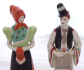 Bílý a ručně barevně malovaný porcelán. Soška stojícího mládence v tradičním maďarském kroji s kloboučkem. Soška stojící dívky v tradičním maďarském kroji s červeným šátkem. Značeno zespodu: zeleně Hollóháza, Hungary, 1831, 20., Kézzel Festett, vtlačené číslo 31., malované značky malířů. Hollóháza manufaktura, Maďarsko 1979 - 1985. Výška 31 cm a 30 cm.