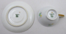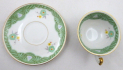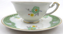 Bílý, barevný a zlacený porcelán. Období a styl: art deco. Porcelánka Hutschenreuther, Selb. Kávový šálek zdobený zeleným florálním ornamentem a stylizovanými květinami ve stylu art deco. Značeno zespodu: zeleně Hutschenreuther, Selb, Bavaria. Německo, Selb 1925 - 1939. Výška šálku 4 cm, průměr podšálku 12 cm.
