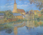 Maďarsko, Gyula, rok 1913 nebo rok 1917. Pastel na papíru 40 cm x 50 cm. Signováno vpravo dole s datací 1913 nebo 1917. Autor: Jan Jáchym (1874-1956). Celkový rozměr s rámem 47 cm x 57 cm. Pohled na římskokatolický Kostel Nejsvětější Trojice v maďarském Gyulu odrážející se na vodní hladině. Tento kostel je jednou z nejvýznamnějších barokních památek v Maďarsku. Jeho stavba byla financována slavným rodem Esterházyů. Stříbrný patinovaný rám se strukturovaným povrchem a sklem.