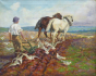 Čechy, rok 1916. Olej na plátně 58 cm x 73 cm. Signováno vlevo dole s datací 1916. Celkový rozměr s rámem 73 cm x 87 cm. Mladý sedlák orající za pomoci dvou koní pole, na které se slétají ptáci, jež vyzobávají pod krustou hlíny ukrytý hmyz. V dobovém dekorativním rámu s bronzovou patinou.