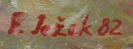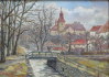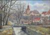 Československo, Doksy, rok 1982. Olej na sololitu 40,5 cm x 56 cm. Signováno vlevo dole s datací 1982. Vzadu strojově čitelný štítek. Autor: F. Ježek. Celkový rozměr s rámem 55 cm x 71 cm. Pohled na architekturu Doks s kamennou lávkou přes říční koryto v popředí. Pohled od Hudební školy směrem ke kostelu. V originálním dobovém rámu.