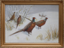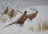 Československo 1920 - 1940. Olej na kartonu 50 cm x 69 cm. Signováno vpravo dole. Autor obrazu: Karel Walter Jizerský (nar. 1892). Celkový rozměr s rámem 59 cm x 78,5 cm. Zimní scenérie párů bažantů a koroptví na sněhové pláni. Originální zlatý rám s reliéfní zdobnou horní lištou. Na malbě místy tečky od hmyzu.