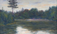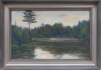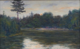 Československo 1920 - 1935. Olej na kartonu 27 cm x 43 cm. Signováno vpravo dole. Autor: Vlastimil Kačírek (1895-1970). Celkový rozměr s rámem 35,5 cm x 51,5 cm. Pohled za rozbřesku na zákoutí vodní plochy se zalesněnými břehy jimž korunuje ztepilá borovice. První sluneční paprsky prosvětlují hladinu. Stříbrný patinovaný rám.