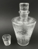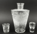 Československo, polovina minulého století. Čiré ručně broušené sklo. Výška karafy 24 cm, výška skleničky 6 cm. Vyšší karafa z čirého skla s jednou malou skleničkou. Dekorováno ručně broušenými stylizovanými ornamenty vinné révy s hrozny, listy a úponky.