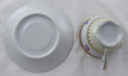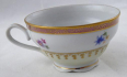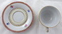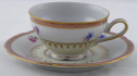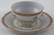 Bílý, barevný a zlacený porcelán. Šálek miskovitého tvaru s prstencem. Šálek s podšálkem zdobený zlatými linkami, horním růžovým okrajem se zlaceným ornamentem. Středový pruh s barevnými kytičkami. V dolní části zlatý věneček na světle žluté glazuře. Neznačeno. Evropa 1900 - 1930. Výška 4 cm, průměr podšálku 12 cm.