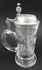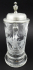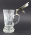 Střední Evropa, minulé století. Křišťálové bezbarvé ručně broušené sklo, cín. Výška 23 cm. Skleněný korbel s rytinou jelena v impozantním postoji v období říje ze druhé poloviny minulého století. Cínové víčko je staršího data, a to z období 1870 - 1910. Na horní straně je dekorováno stylizovaným monogramem.
