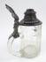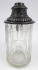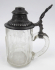 Čechy 1890 - 1920. Čiré ručně broušené sklo, cín. Výška 18,5 cm. Korbel s ručně broušenými svislými fazetami a centrálním reliéfním medailonem se stylizovaným písmenem H. Po stranách medailonu ručně rytý výjev jelena na pasece a na druhé straně vysoký listnatý strom. Cínové víko zdobené reliéfními maskarony a florálními ornamenty. Značka vyznačující objem u ucha s vyvýšenou opěrkou palce: 1/2 L.