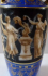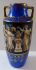 Porcelán bílý, barevný a zlacený. Vázička ve tvaru amfory. Zdobená uprostřed florálním motivem antických dívek při slavnosti. Horní a spodní část v modré barvě se zlaceným ornamentem. Úzké hrdlo s dvěma postranními úchyty. Značená zespodu. Evropa, minulé století. Výška 9 cm.