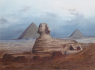 Egypt, Káhira 1890 - 1920. Akvarel a kvaš na papíru 31 cm x 44 cm. Signováno vpravo dole a nápis Cairo (Káhira). Celkový rozměr s rámem 48 cm x 61 cm. Velká sfinga v Gíze spolu s pyramidami zachycená před více jak sto lety. Ve zlaceném rámu dekorovaném reliéfními florálními ornamenty, s paspartou a sklem.