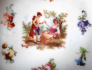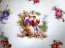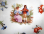 Porcelán bílý, barevný, zlacený a glazovaný. Kulatého tvaru. Zvýšené prořezávané okraje, se zlatými linkami a reliéfním festonem. Uprostřed ve zlatém kruhu, motiv galantní scény a drobných kvítků okolo. V každé misce jiný romantický výjev. Neznačeno. Střední Evropa 1890 - 1930. Průměr mísy 22,5 cm a výška 6 cm, průměr misky 13 cm a výška 3,5 cm.