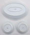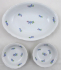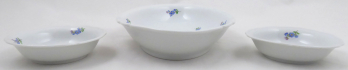 Bílý a ručně barevně malovaný porcelán. Bílá porcelánová oválná mísa a dvě misky s obloukovitě tvarovaným horním okrajem zdobené ručně malovanými květy pomněnek. Značeno zespodu: modré zkřížené meče, vtlačená čísla, ručně psané značky malíře. Německo, Míšeň 1900 - 1934. Rozměr: mísa 26 cm x 9 cm x 4,5 cm, misky 12,5 cm x 3 cm.