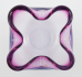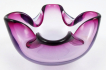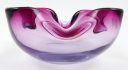 Československo, třetí třetina minulého století. Ametystové a fialové hutně tvarované sklo. Průměr 12,5 cm, výška 6 cm. Miska či popelník z ametystového a fialového skla s laločnatě tvarovaným okrajem.