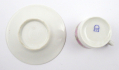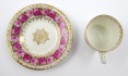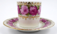 Německo, Suhl 1880 - 1920. Bílý, barevný a ručně zlacený porcelán. Známá pruská porcelánka Erdmann Schlegelmilch založená roku 1861 v Suhlu. Výška šálku 4,5 cm, průměr podšálku 9,5 cm. Malý moka šálek bohatě zdobený pásy věnečků růží ohraničených zlacenými florálními ornamenty. Značeno zespodu: značka výrobce.