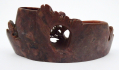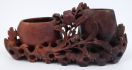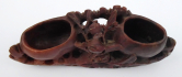 Čína, minulé století. Steatit (mastek) ručně řezbovaný. V tradičním čínském stylu. Výška 7 cm, šířka 16 cm. Ručně řezbovaná dvojitá nádobka na tuš oválného tvaru ze steatitu v tradičním čínském stylu dekorovaná vinoucími se úponky s listy a poupaty květů.