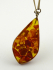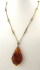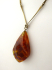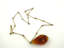 Zlatavě zabarvený kov, přírodní jantar. Celková hmotnost 19,75 g. Velký závěs organického tvaru kapky z přírodního jantaru s přírodními inkluzemi. Designový řetízek z obdélných plochých stáčených článků ve stylu 60. - 70. let minulého století. Pobaltí, druhá polovina minulého století. Délka s řetízkem 370 mm, výška přívěsku 55 mm.