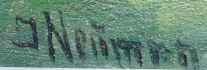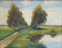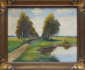 Střední Evropa 1900 - 1920. Olej na plátně 35 cm x 45 cm. Signováno vlevo dole. Celkový rozměr s rámem 42 cm x 52 cm. Pohled na dlouhou odvíjející se cestu mezi břízami. V popředí malá vodní plocha, v níž se odrážejí bílá oblaka. Ve velmi pěkném rámu se zlacenými ornamenty listů a vnitřní zlacenou lištou tvořenou reliéfním punktováním.