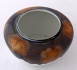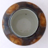 Bílý, barevný, glazovaný porcelán. Z období německé secese. Miska kulatého uzavřeného tvaru s klenutou horní částí a prstencovitým horním okrajem. Zdobená v horní polovině stékaným hnědým irizovaným dekorem. Značená zespodu: vtlačená písmena C. W. a koruna, písmena V. G., číslice, nezřetelná modrá značka (Wilhelms Feider Jaspis). Německo, Oeslau 1900 - 1920. Výška 9,5 cm, šířka 16,5 cm.