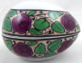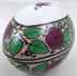 Bílý, ručně barevně malovaný porcelán. V německém secesním stylu. Paepcke & Schäffer, Haida. Bílá porcelánová dóza ve tvaru vejce zdobená ručně malovanými pásy s motivem růží s listy, černé linky. Značeno zespodu: písmena a vavřínový věnec. Československo, Bor u České Lípy 1920 - 1938. Výška 10 cm, šířka 14 cm.