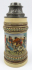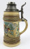 Německo 1890 - 1930. Tvrdá světlá glazovaná kamenina, ruční malba, cín. Výška 24 cm. Pivní korbel z tvrdé kameniny se světlou glazurou a ruční malbou zobrazující vesnickou pijatiku doprovázenou hrou v kuželky a muzicírováním pod širým nebem. Dekor korbelu doplněn o reliéfní florální věnečky, vlnovky a punktování. Velmi pěkné zdobné víko a úchyt korbelu s palmetami. Ve výborném stavu. Značeno zespodu: čísly.