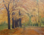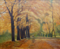 Čechy 1910 - 1930. Olej na kartonu 39 cm x 50 cm. Signováno vpravo dole Konvalička či Konvaleček. Celkový rozměr s rámem 43 cm x 54 cm. Pohled na alej ve zlatavé barevnosti podzimu. V jednoduchém zlaceném rámu.