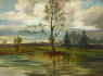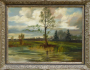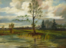 Československo 1920 - 1935. Olej na dřevěné desce 72 cm x 97 cm. Signováno vpravo dole. Autor obrazu: Viktor Rolín (1887-1942). Celkový rozměr s rámem 89 cm x 113 cm. Osamělý vzrostlý strom v poryvech větru stojící u vodní hladiny s rákosím pod zamračenou oblohou věštící příchod bouře. Originální galerijní rám francouzského typu s ornamenty ve stříbrné patině.