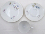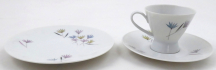 Bílý a barevný porcelán. Název modelu: Grass. Autor designu: Richard Latham a Raymond Loewy. Bílý porcelánový designový šálek s podšálkem a dezertním talířkem. Zdobené barevným ornamentem různorodých travin. Značeno zespodu: zeleně Rosenthal, Selb, Germany, písmeno F. Německo, Rosenthal, od roku 1954. Rozměr: výška šálku 6 cm, průměr podšálku 13 cm, průměr dezertního talířku 15 cm.