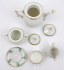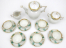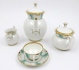 Bílý, barevně ručně malovaný a zlacený porcelán. Období a styl: art deco. Název modelu: Hella. Německo, Rosenthal, od roku 1954. Elegantní art deco ručně malovaná a zlacená kávová souprava s motivy kapradin a přesliček doplněných o linky a mřížky. Silně zlacené horní zdobné okraje, víka i úchyty. Značeno zespodu: Rosenthal, Kronach-Bavaria, Hella, výrobní číslo a značka malíře. Německo, Kronach 1929-1937. Výška šálku 4 cm, průměr podšálku 11 cm, výška konvice 17 cm, výška konvičky na mléko 6 cm a výška cukřenky 10 cm.