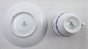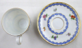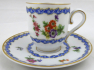 Kávový šálek s modrým věnečkem a květinami. Bílý, barevný a zlacený porcelán. Porcelánka Rosenthal. Moka šálek válcovitého tvaru se zlatými linkami. Šálek s podšálkem zdobený horním a spodním modrým věnečkem a barevnými květinami s kvítky. Značeno zespodu: Rosenthal, značka malíře. Německo, Rosenthal 1921 - 1922. Výška 6 cm, průměr podšálku 11,5 cm.